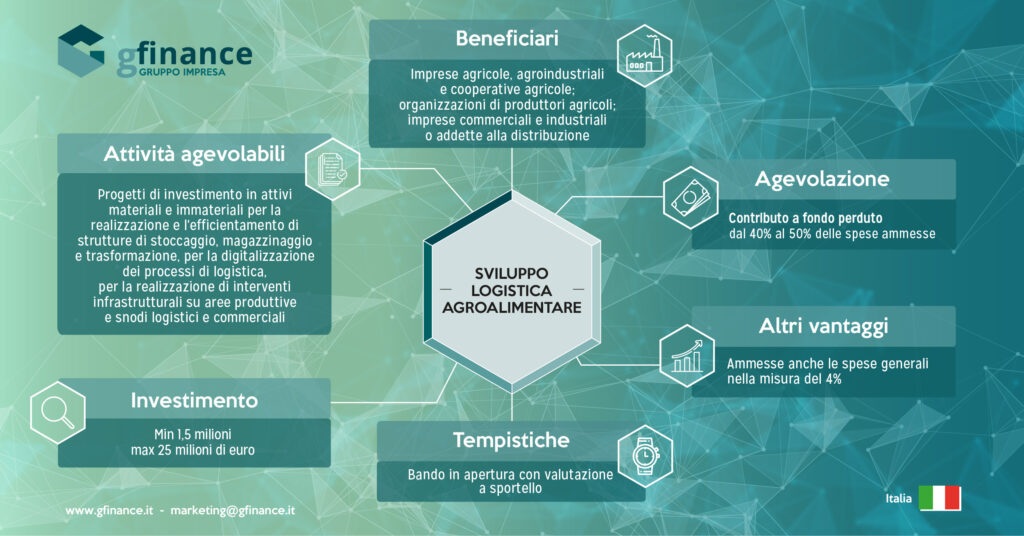 Il bando finanzia progetti di investimento in attivi materiali e immateriali per la realizzazione e l’efficientamento di strutture di stoccaggio, magazzinaggio e trasformazione, per la digitalizzazione dei processi di logistica, per la realizzazione di interventi infrastrutturali su aree produttive e snodi logistici e commerciali.