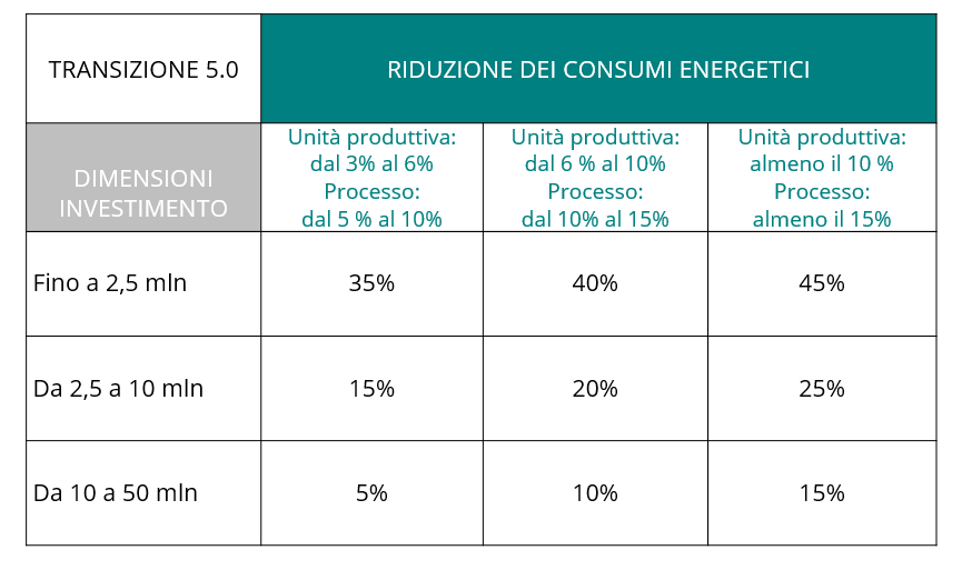 - Per investimenti fino a 2,5 milioni dal 35% al 45%,
