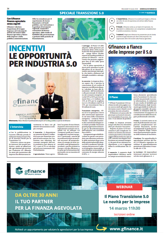 Per approfondire le agevolazioni previste dal Piano 5.0 Gfinance organizza un webinar di approfondimento gratuito per il prossimo 14 marzo alle ore 11.30. Gli imprenditori interessati possono iscriversi al sito www.gfinance.it
