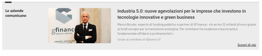 «Per aggiudicarsi tali risorse non basterà adeguarsi a norme e regolamenti europei, ma servirà comprendere i nuovi scenari per il futuro, adottando modelli di business più sostenibili, e favorire lo sviluppo di nuove competenze in azienda – spiega Marco Nicolai, esperto di funding pubblico e partner di GFinance, da oltre 30 anni un punto di riferimento in Lombardia per il settore della finanza agevolata. In questo contesto, comprendere appieno le implicazioni e le opportunità legate alla sostenibilità diventa cruciale per le imprese che aspirano a rimanere competitive e prospere nel panorama economico in evoluzione del 2024».